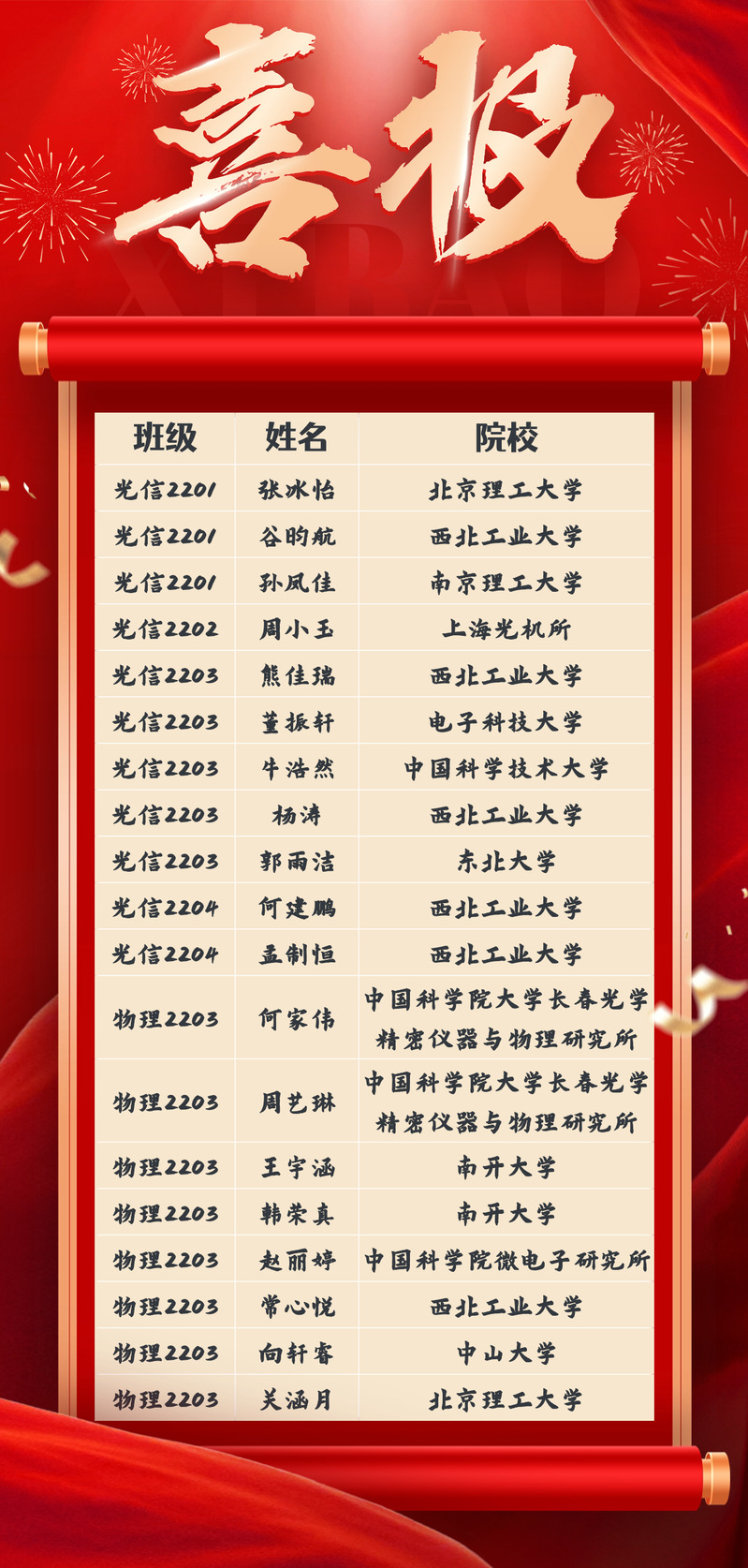 用智慧点亮未来,以拼搏铸就梦想。威廉希尔app 2026届19名同学成功推免保研到理想的高校,其中,有11名同学来自光电信息科学与工程专业,有8名同学来自应用物理学专业。